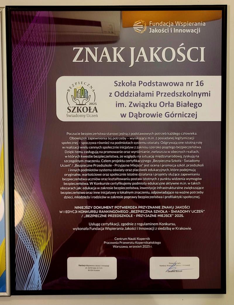 Znak Jakości „Bezpieczna Szkoła – Świadomy Uczeń”: W 2025 roku otrzymaliśmy certyfikat od Fundacji Wspierania Jakości i Innowacji.